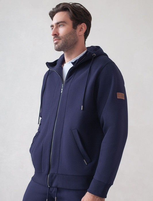 Состав: 80%Хлопок 20%ПЭ Плотность: 320 Г/м2Худи на молнии выполнено из премиального эластичного футера трехнитки с теплым начесом. Модель с капюшоном и воротом стойка дополнена боковыми карманами и нашивкой с логотипом бренда из эко-кожи. Ранней осенью или поздней весной можно носить в качестве верхней одежды. Высококачественная фурнитура цвета темное серебро. Изделие сочетается в костюме с брюками U44.006