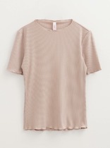 Футболка из полиамида, белого цвета, с короткими рукавами, с небольшим горлом, в рубчик, облегающая, укороченная.