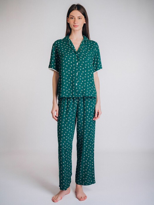 Пижама выполнена из мягкой и приятной на ощупь вискозы с приятным принтом в мелкий цветочный узор, создающий свежий и нежный образ.