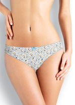 Женские трусы от торговой марки Индефини. Трусы-стринги из хлопка, бежевого цвета, с принтом, с кружевным обрамлением, на мягкой резинке, средней посадки.