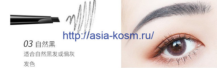 Способ применения: аккуратными и точными движениями проведите линию красящей стороной, а затем закончите свой образ с помощью щеточки, придав бровям желаемую форму.