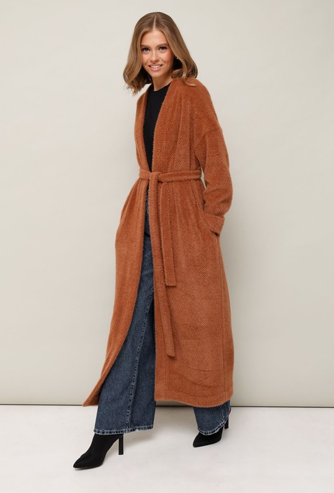 Женский кардиган прямого кроя, выполнен из мягкого пушистого трикотажного полотна. Горловина спинки и борта обработаны притачной планкой. Длинные рукава со спущенной линией втачивания плеча, по низу обработана манжета. В боковых швах внутренние карманы. В комплекте прилагается пояс из основной ткани.