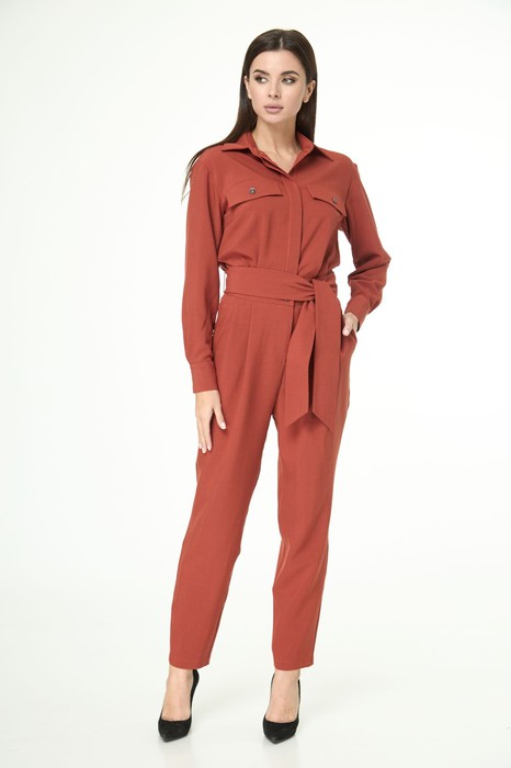 Комбинезон полуприлегающего силуэта, на передних частях обработаны нагрудные вытачки и клапаны, потайная застежка планка на петли и пуговицы, спинка с кокеткой, по центру складка на свободу движения.