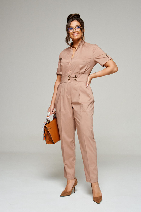 Комбинезон отрезной по линии талии. На втачном поясе выполнены декоративные элементы-люверсы.