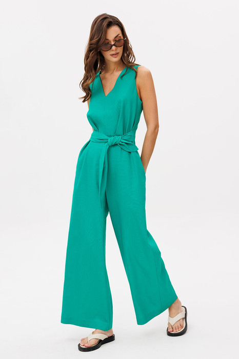 Комбинезон женский, без рукавов, с V-образным вырезом горловины по полочке и спинке. Отрезной по талии. Полочка в верхней части со складкой, с карманами и завязками в боковых швах. Спинка с выточками по талии. В боковые швы вставлен фигурный пояс по талии.