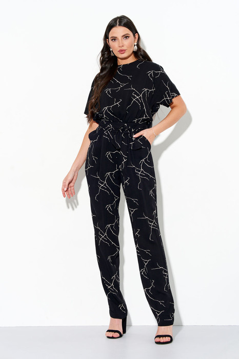 Женский летний комбинезон полуприлегающего силуэта с цельнокроенными рукавами и карманами в боковых швах, отрезной по линии талии, по спинке V-образный вырез с имитацией запаха. В комплекте съемный пояс из основной ткани.
