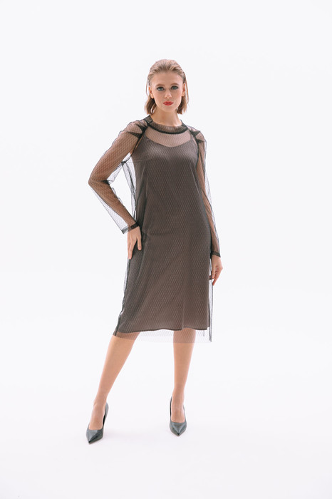 Комплект двухпредметный: нижнее платье-комбинация+верхнее платье из сетчатой ткани. Платье-комбинация полуприлегающего силуэта на регулируемых бретелях. По переду - нагрудные вытачки. Верхнее платье из сетчатой ткани с округлой горловиной. Защипы на рукаве-реглане делают образ максимально женственным и элегантным. В боковых швах есть разрезы.