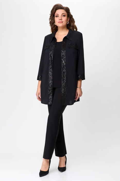 Жакет женский прямого кроя с втачным рукавом. Застежка центральная на молнию. По горловине отложной воротник. По переду декоративные клапаны и планка. По линии груди вытачки. В боковых швах обработаны разрезы. Рукав 7/8 с манжетой. Клапаны, планка по переду и манжеты выполнены из ткани с пайеткой.
