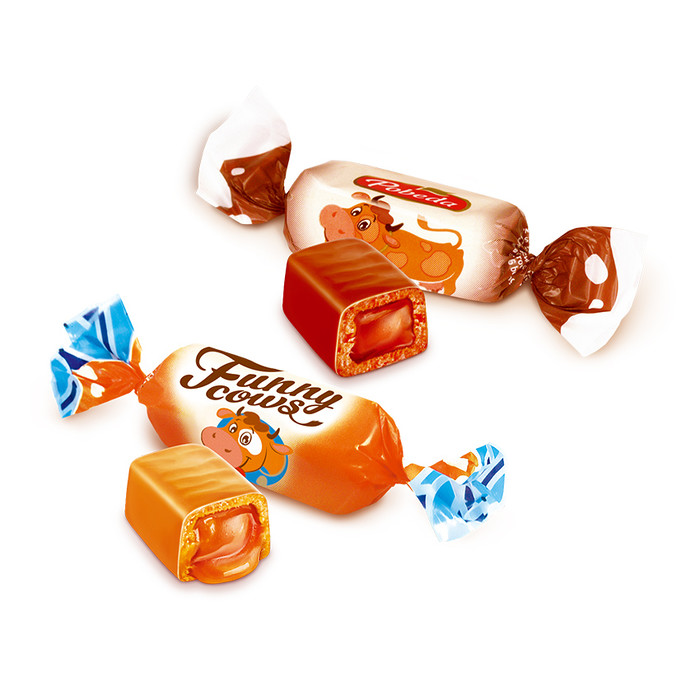 Всеми любимая «Коровка» от фабрики «Победа» – это натуральные сливочное масло и сгущенное молоко. Мягкий сливочно-карамельный вкус с легким оттенком топленого молока и начинка со сгущенкой. В этом ассорти два вкуса: со сгущенным и вареным сгущенным молоком. Хочется раскусить и, как в детстве, на миг забыть обо всем.