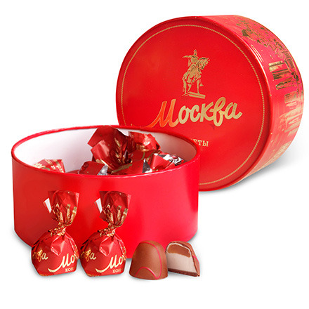 Конфеты «Москва» – воздушное суфле с ядрышком из мягкой карамели, покрытое молочным шоколадом с декоративными узорами красных полос.