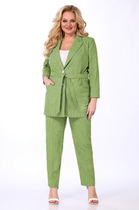 Костюм женский из кулирного полотна состоит из кофты и брюк. Кофта прямого силуэта, рукав-реглан длинный на манжете, горловина круглая, обработана окантовкой, низ изделия на поясе, на полочке принт. Брюки прямые, верх на поясе с резинкой, в боковых швах внутренние карманы, низ на манжете.
