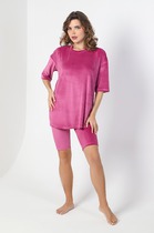 Темный костюм из кулирки майка + шорты. Майка темная, сбоку принт в виде узора их огурцов и растительных мотивов, планка с декоративными кнопками. Аналогичный дизайн шорт, длина чуть выше середины бедра. Размеры от 40 до 52. Есть возможность розничного приобретения товара.