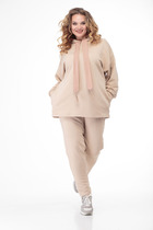 Костюм женский из кулирного полотна состоит из футболки и брюк. Футболка прямого силуэта, горловина круглая, обработана окантовкой, спущенное плечо, рукав короткий втачной, по низу изделия кулиска со шнуром, на полочке принт. Брюки прямые, верх на поясе с резинкой, в боковых швах внутренние карманы, низ изделия на резинке.