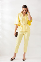 Костюм женский с брюками. Толстовка прямого покроя. Низ на завязках, рукава на манжетах. Слева на груди принт в виде надписи. Брюки длиной до щиколотки, со стрелками и с боковыми карманами. Пояс и низ на резинке.