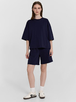 Комплект состоит из футболки и бриджей. Футболка полуприталенного силуэта, с цельнокроеным коротким рукавом, с фигурной горловиной, с удлиненной спинкой и асимметричной линией низа на полочке. Бриджи средней длины, с лампасом из отделочного полотна вдоль боковых швов, на резинке.