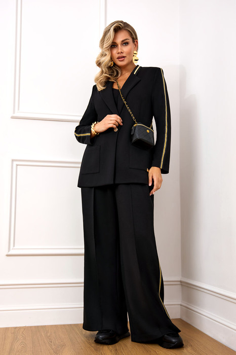 Стильный и мега крутой костюм, выполнен из премиального трикотажа Бифлекс (не скатывается и идеально держит форму). Жакет прямого силуэта, без подкладки. Перед жакета по горловине декорирован трикотажным довязом, что придает модели особую изящность. Жакет с накладными карманами и декорирован пришивным металлическим украшением, с застежкой на пуговицу. Рукав полной длины, декорированы пришивным трикотажным лампасом. Брюки прямые, пояс на резинке, в боковых швах с функциональными карманами. По бокам брюк настрочной трикотажный лампас. Модель костюма стильная и практичная, займет почетное место любимой модели в вашем гардеробе, отлично подойдет для ежедневной носки и работы, удобно носить с кроссовками и любой классической обувью.