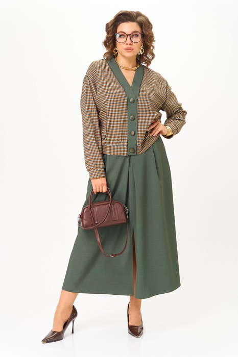Этот костюм — воплощение интеллектуальной элегантности. Мягкий светло-серый кардиган с коричневыми кантами и крупными пуговицами создаёт образ уютного шарма. V-образный вырез визуально вытягивает шею, а контрастные детали подчёркивают чёткость линий. Рукав на спущенной плойме с манжетой по низу. По перду накладные карманы с декоративной нашивкой.  Коричневая юбка миди с глубокими встречными складками и разрезом по переду добавляет образу женственности. В боковых швах карманы. Юбка на подкладке.  Для максимально комфортной посадки по бокам пояса вставлена эластичная резинка. Сочетание мягкого верха и строгого низа создаёт баланс между комфортом и аккуратностью, делая комплект универсальным для офиса, повседневных выходов и стильных деловых встреч.