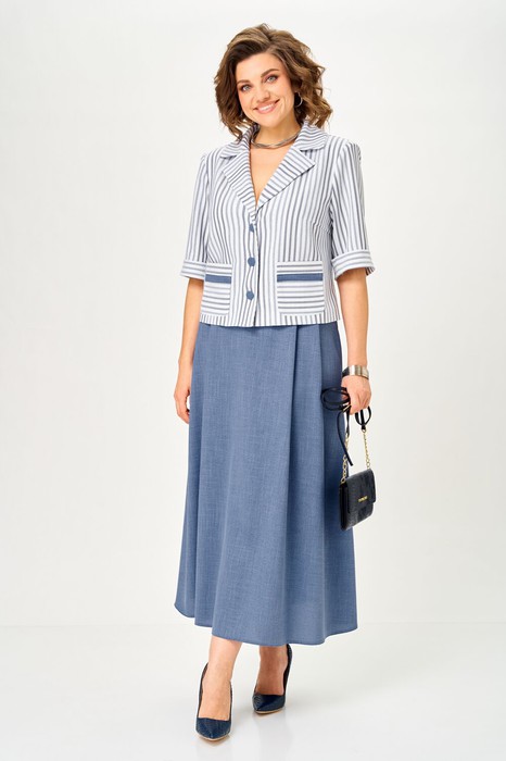 Комплект женский состоит из жакета и юбки. Элегантный женский жакет без подкладки с воротником пиджачного типа и застежкой на 3-и петли и пуговицы. По левой части переда накладные карман с декоративными планками. Рукав втачной двухшовный с манжетой по низу. Юбка А-образного силуэта со складками по переду, в боковых швах карманы. Для максимально комфортной посадки по бокам пояса вставлена эластичная резинка. Длина жакета 50 см, длина рукава 31 см, длина юбки 88 см.