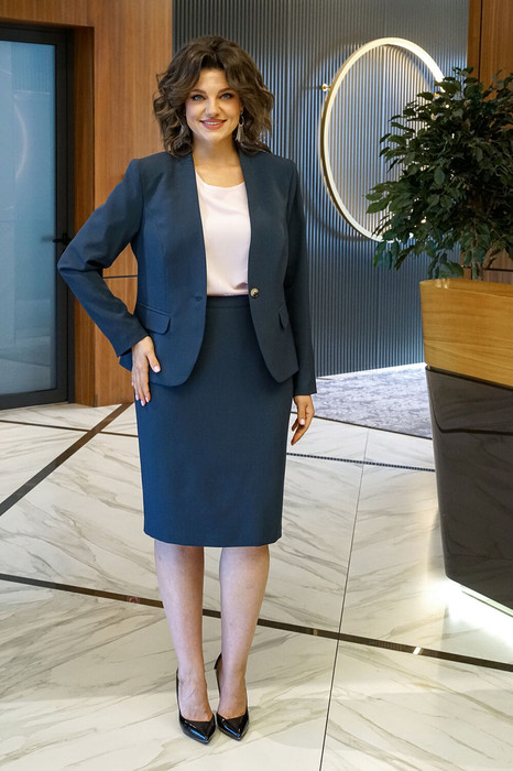 Жакет женский полуприлегающего силуэта, на подкладке, с центральной застёжкой на петлю и пуговицу. Перед с рельефными швами, с прорезными карманами с клапаном и двумя обтачками. Спинка со средним швом и рельефными швами. Рукава втачные, двухшовные, длинные, на продолжении локтевого шва шлица  декорирована одной пришивной пуговицей. Воротник втачная стойка.