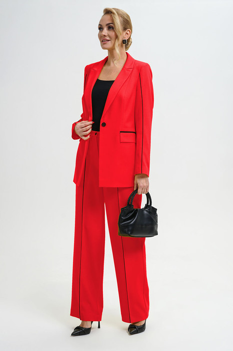 Жакет полуприлегающего силуэта, на подкладке, с центральной застёжкой на петлю и пуговицу. По верхней части рукава отделочная тесьма.