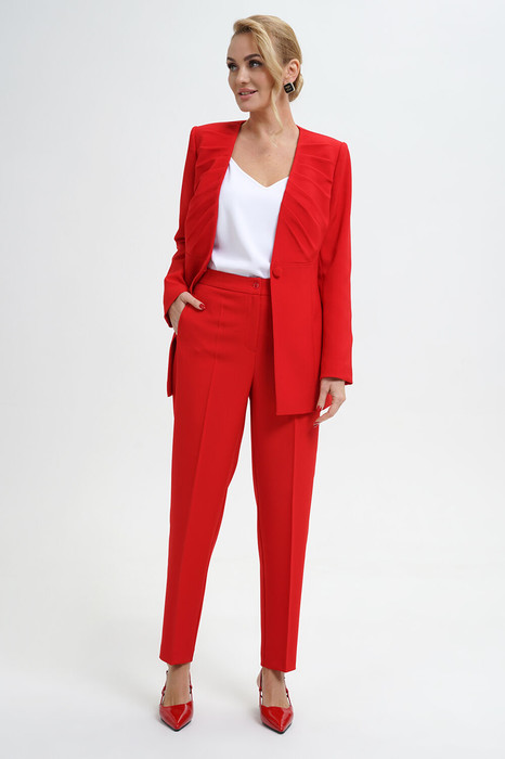 Жакет полуприлегающего силуэта, на подкладке, с застёжкой на петлю, пуговицу. Перед с конструктивным фигурным подрезом, с рельефными швами. Спинка со средним швом и рельефными швами. Рукава втачные, двухшовные, длинные. По горловине переда складки .