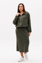 Жакет полуприлегающего силуэта, перед на подкладке, с двух-бортной застёжкой на петли, пуговицы и с внутренней застёжкой на петлю и пуговицу. В дополнении ремень с пряжкой из основной ткани.