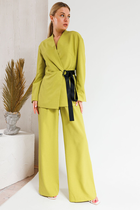 Жакет полуприлегающего силуэта со спущенным плечом и V-образным вырезом. По правой полочке драпировка. Жакет на подкладке.По переду в рельефах действующие карманы. Застежка на декоративный пояс и потайную пуговицу. Декоративный пояс выполнен из репсовой тесьмы. Рукав втачной.По низу рукава отлетная декоративная шлица. Спинка со средним швом и рельефами.