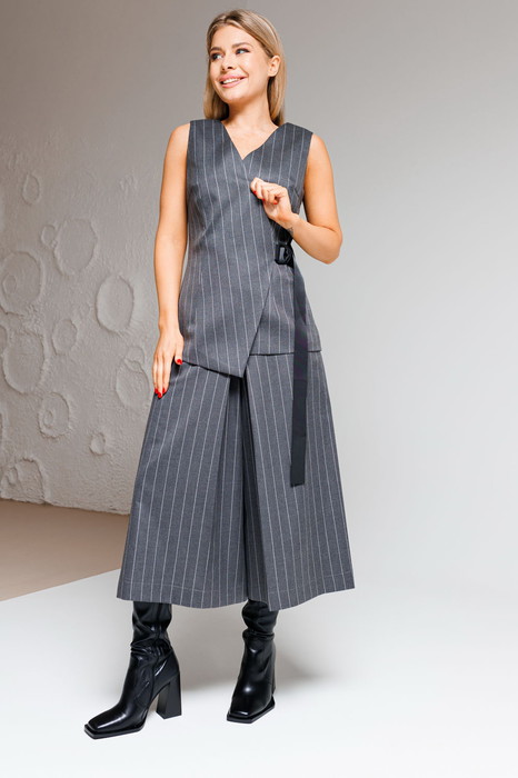 Костюм двухпредметный, состоящий из элегантного женского жилета, полуприлегающего силуэта с застежкой на декоративную тесьму, полукольцо и потайную пуговицу. Жилет на подкладке.