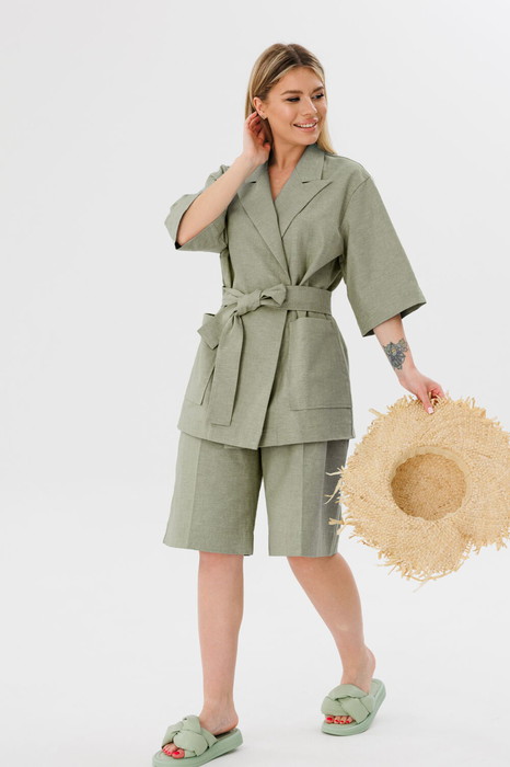 Жакет женский свободного силуэта со спущенным плечом. Рукав короткий. По переду накладные карманы. Жакет без подкладки, с поясом из основной ткани.