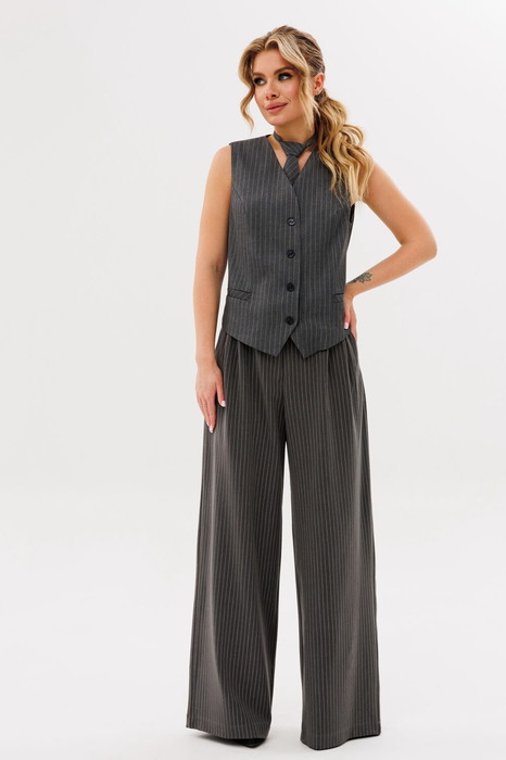 Жилет полуприлегающего силуэта, на подкладке. По переду рельефа карманы "листочки", застёжка на петли-пуговицы. По спинке вытачки.