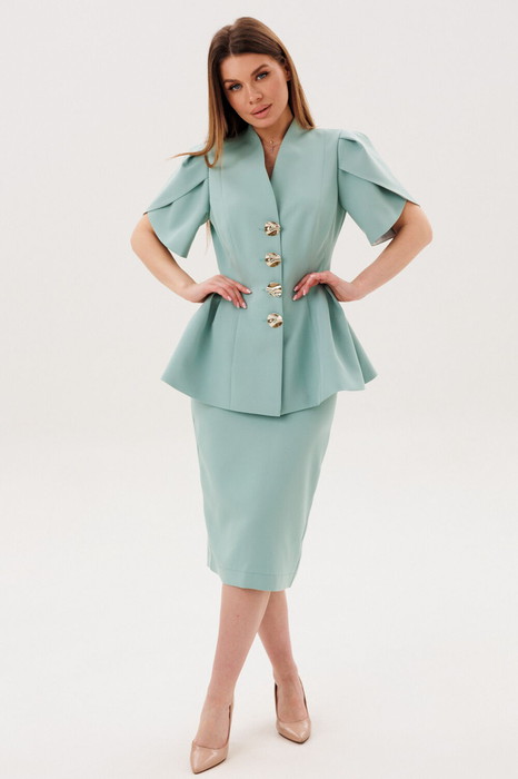 Жакет на подкладке, по переду застежка на металлические пуговицы, рукав"фонарик". По низу жакета баска.