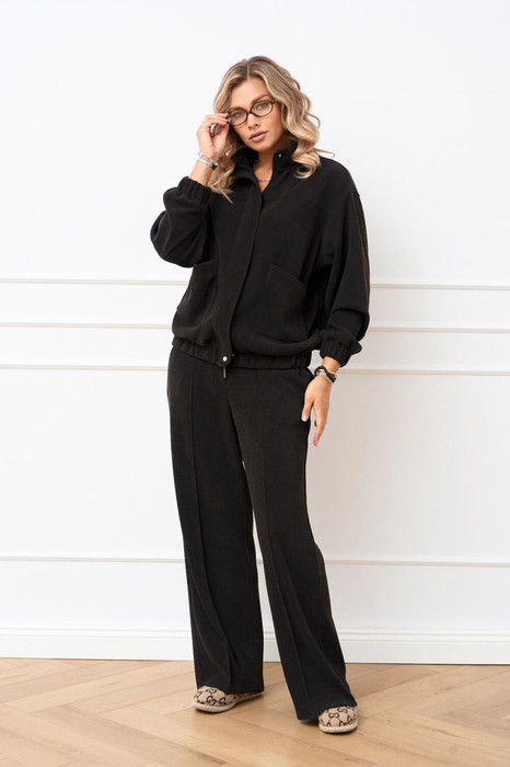 Костюм из трикотажной ткани в рубчик под штрукс, состоящий из джемпера и брюк. Джемпер прямого силуэта, по полочке обработана кокетка и в области талии накладные карманы с асимметричным краем, застежка центральная на тесьму молнию закрытая ветрозащитной планкой фиксирующаяся кнопками. Воротник стойка. Низ изделия на притачном поясе с эластичной тесьмой. Линия плеча слегка спущена, рукав втачной по низу притачная манжета с эластичной тесьмой. Брюки прямого силуэта, в боковых швах обработаны карманы. Верхний срез обработан притачным поясом по задним половинкам для лучшей посадки вставлена резинка, застегивающийся на петлю и пуговицу, застёжка центральна с гульфиком и откоском на тесьму