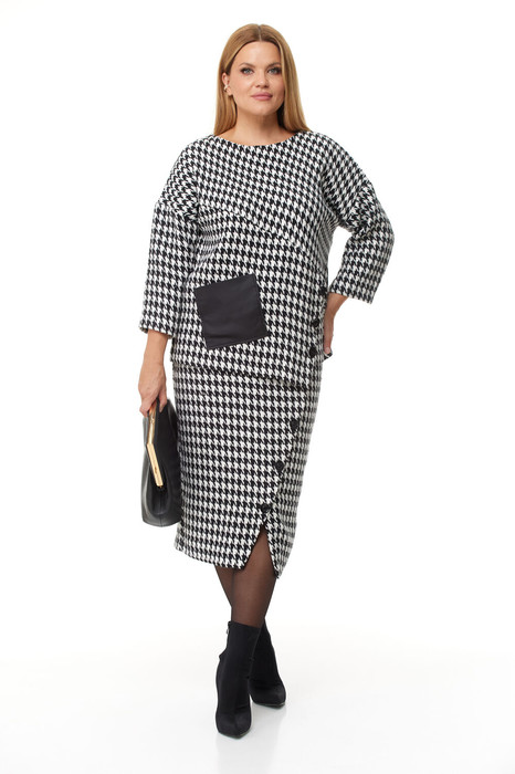 Комплект женский 2-х предмеиный ( блузка, юбка) из текстилькой ткани. Блуза прямого силуэта со спущенным плечом, низ по полочке фигурный, симметричный. По полочке идет кокетка в виде подреза, отделка в виде пуговиц и накладной карман (из эко-кожи). По спинке средний шов, рукав 3/4 длины. Юбка зауженная к низу, по полочке идет ассемитричный подрез с пуговицами. По спинке средний шов, шлица , пояс отрезной с резинкой. Длина блузы (по спинке):(50-54)- 59см, (56-60)-62 см. Длина рукава: (50-60)-33см. Длина юбки: (50-60):-73см.