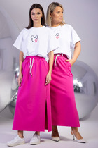 Комплект женский 2-х предметный (блузка, брюки). Костюм отлично подойдет как для повседневной носки (работа, офис, прогулки), так и для праздничных выходов. Достаточно дополнить его соответствующими аксессуарами. Предметы комплекта легко будут сочетаться с вещами из Вашего гардероба.   Блузка из трикотажного полотна. Модель прямого силуэта, рукав углублённый, рубашечного типа. Перед  с запахом, низ блузы ассиметричный, по полочке углы, спинка закруглённая, удлинённая. По рукаву идут защипы. Брюки из текстильной ткани, прямые, пояс на резинке, по бокам карманы. На горловине блузки  пришит логотип фирмы. Длина блузки (по спинке): (46-58) - 78 см. Длина рукава: (46-58) - 45 см. Длина брюк: (46-58) - 101 см