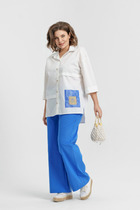 Женский брючный костюм — это идеальное сочетание стиля, комфорта и универсальности, которое станет вашим верным спутником как на деловых встречах, так и при повседневной носке. Изготовленный из высококачественной ткани, этот костюм обеспечивает легкость и приятные ощущения при носке. Костюм женский 2-хпредметный (жакет и брюки). Жакет из текстильной ткани прямого силуэта со спущенным плечом. По полочке идут грудовые выточки из бокового шва. Застежка ассиметричная. Воротник стойка. По спинке встречная складка. Рукав 3/4. По полочке идут отлетные накладные карманы с декором (термонаклейка). Брюки прямые, зауженные к низу за счет защипов. Пояс на резинке, по бокам карманы. Длина спинке:(48-52)-70см, (54-58)- 73см. Длина рукава:(48-58)-33см. Длина брюк (48-50) -93см, (52-58)-95см