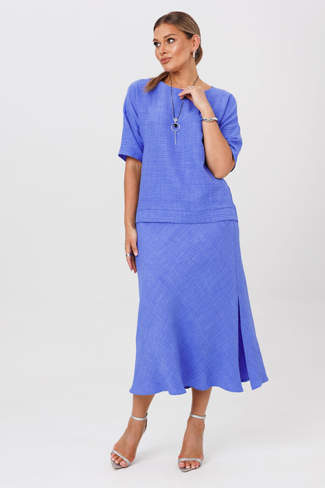 Костюм женский от Anastasia состоит из 2 предметов: блузки и длинной юбки миди. Костюм подойдет как для повседневной носки, так и для торжества. Достаточно обыграть его соответстующими аксессуарами. Юбка миди - тренд современной моды любят комбинировать с базовыми футболками и кроссовками, создавая при этом шикарные кэжуал образы. Блузка прямого силуэта со спущенным плечом. По низу полочки идет отрезной пояс, спинка удлиненная. Юбка по косой, пояс на резинке, сбоку разрез. Длина блузки (по спинке): (50-54)-68см, (56-60)-71см. Длина рукава: (50-54)-20см, (56-60)-22см. Длина юбки (50-60) -96 см.