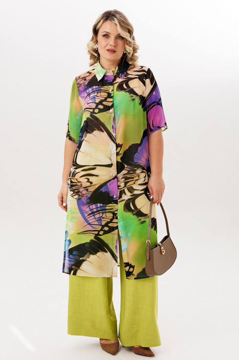 Комплект женский 2-х предметный (блузка, брюки) из двух видов ткани. Этот костюм сочетает в себе элегантность и комфорт, что делает его подходящим как для деловых встреч или домашней одежды, так и для праздничных мероприятий. Блузка из шифоновой ткани длинная, прямая. По переду нагрудные выточки с проймы. По боковым швам разрезы. Воротник на отрезной стойке, застежка планка на петли и пуговицы.Рукав втачной одношовный. Брюки-палаццо прямые широкие, пояс на резинке, по низу широкая подгибка. Имеет оригинальный и современный крой, придающий образу особую изысканность. Брюки палаццо, благодаря своему поясу на резинке, могут растягиваться до большого размера, поэтому подходят для любой фигуры, будь то девочка-подросток или взрослая женщина. Длина блузки: (50-54)-112 см., (56-62)-114 см. Длина рукава: (50-54)-32 см., (56-62)-34 см. Длина брюк: (50-54) - 102 см, (56-62) - 105 см