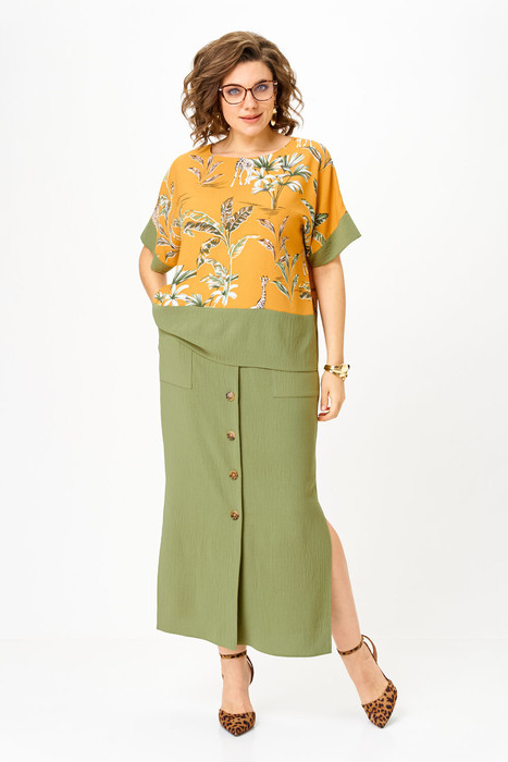 Летний костюм от Anastasia, подходящий для нарядной и повседневной носки. Костюм женский 2-х (блузка, юбка). Блузка прямого силуэта со спущенным плечом. Отделка из однототна по низу и манжет. Юбка прямая, по бокам разрезы. По передней части идут накладные карманы, по центру скаладка, имитирующая застежку с пуговицами. Пояс на резинке. Длина блузки (50-54)- 58см, (56-60)- 60см . Длина рукава от горловиный (50-54)- 35см, (56-60)-37см. Длина юбки (50-60)- 90 см.