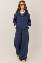 Брюки полной длины, прилегающие в области бедер и свободные в колене и по низу. Брюки со стрелками. По передним половинкам выполнены наклонные карманы. В левом боковом шве обработана застежка на потайную молнию. По талии брюки на притачном поясе с эластичной тесьмой и застежкой на петлю и пуговицу. По поясу брюк обработаны шлевки под ремень.