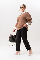 Юбка длиной миди, прямого силуэта. Передняя часть юбки по центру со складками и потайным разрезом с левой стороны. Задняя часть юбки с талиевыми вытачками. По талии юбка на притачном поясе, пояс с эластичной тесьмой и застежкой на петлю и пуговицу.