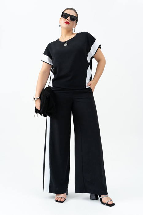 Костюм женский брючный. Блузка прямого силуэта, со вставками по переду, с спущенными плечами, с окантовкой. Брюки женские повседневные свободного кроя , на притачном поясе со шлевками по переду и поясом завязкой, пояс по спинке с резинкой, Передние половинки с боковыми наклонными карманами. Задние половинки с талевыми вытачками.