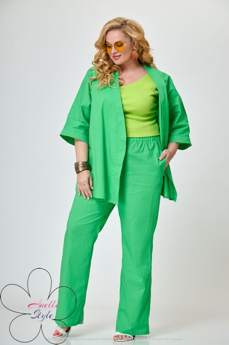 костюм женский из льна. Кимоно оверсайз, длиной до середины бедра. Рукав 3/4, низ широкий на манжете, без застежки. По переду фигурный запах. Талию можно подчеркнуть при помощи съемного пояса или комбинировать с корсетом.