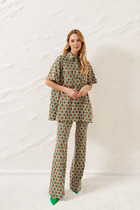 Брюки с высокой посадкой прекрасно дополняют жакет. Они длинные и расширяются к низу, что придает им элегантность и стиль. Передняя часть брюк оснащена боковыми карманами, а застежка выполнена на гульфике с молнией. Пояс находится от бокового шва по спинке и имеет резинку для комфорта, а передняя часть закрывается петлей и пуговицей.