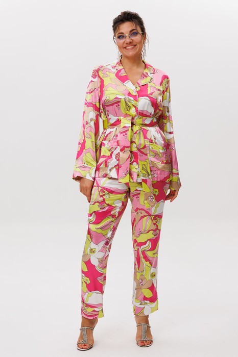 Функциональность сочетается с изяществом: блуза дополнена накладными карманами с фигурной обработкой кантом, а брюки — удобными врезными карманами. Съёмный пояс, завязывающийся на талии, позволяет подчеркнуть линию силуэта, добавляя ноту женственности.