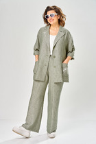 Низ костюма это юбка-брюки-кюлоты на высокой талии, струящиеся и расклешённые. Модель на запах с мягкими складками создаёт ощущение простора и лёгкости, а скрытые, фигурные карманы в швах берегут чистоту линий.