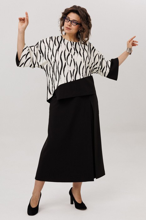Низ костюма это юбка-брюки-кюлоты на высокой талии, струящиеся и расклешённые. Модель на запах с мягкими складками создаёт ощущение простора и лёгкости, а скрытые, фигурные карманы в швах берегут чистоту линий.