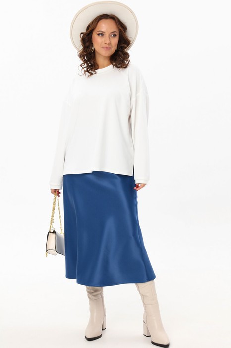 Модный женский комплект состоит из атласной юбки и однотонного свободного джемпера.