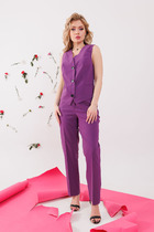 Однобортный жакет полуприталенного силуэта, на подкладке, с плечевыми накладками. Воротник пиджачного типа с отложными лацканами. По переду центральная застежка на петли и пуговицы и прорезные карманы с клапаном, талиевые вытачки и рельефы. Низ бортов закругленной формы. Спинка со средним швом и рельефами. Рукав втачной двухшовный длинный.