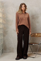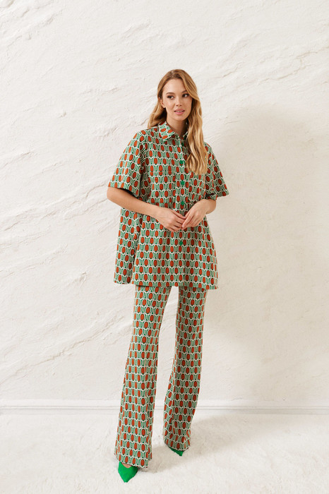Комфортный комплект состоящий из рубашки и брюк выполнен из трикотажного полотна. Характеристики: рубашка прямого свободного кроя, воротник классический - отложной, застежка центральная на петли пуговички, по переду крупные карманы, рукав втачной короткий, в боковых швах разрезы спинка цельнокроеная. Длина рубашки по спинке 75 , длина рукава 27 см. Брюки - прилегающий силуэт, брюки без пояса - на подгибе, подгиб в области талии на резинке. Длина 114 см.