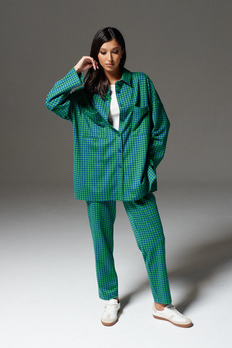 Комплект состоит из рубашки и брюк выполнен из трикотажного полотна с абстрактным геометрическим принтом.Характеристики: рубашка прямого свободного кроя, воротник классический - отложной, застежка центральная на петли пуговички, по переду крупные карманы, рукав спущен, в боковых швах разрезы. Длина рубашки по спинке 72 , длина рукава 74 см от края горловины. Брюки прямого кроя, пояс на резинке, в боковых швах карманы. Длина брюк 98 см.